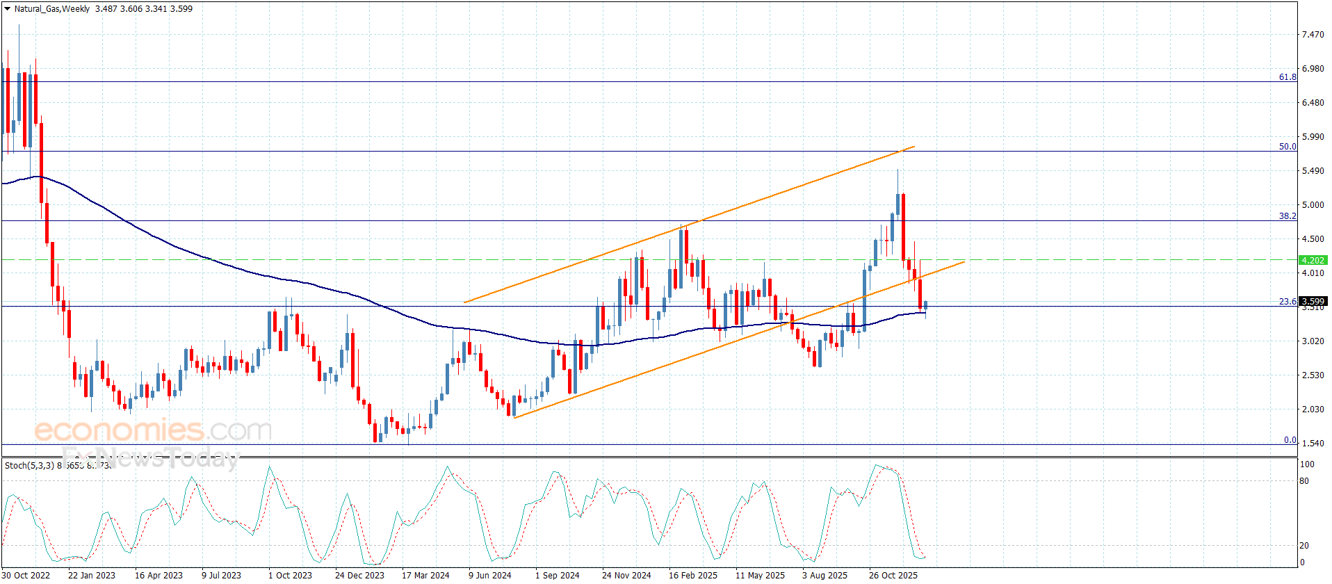 Cena zemného plynu sa poddala stabilite kĺzavého priemeru 55 blízko úrovne 3,420 USD, čo vytvorilo silnú prekážku proti medvedím pokusom o zaznamenanie jej rastu smerom k 3,620 USD a oddialenie negatívneho útoku.