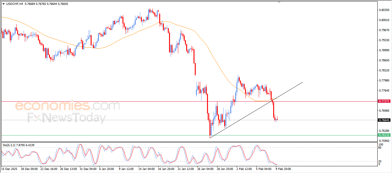 Cena (USDCHF) sa ustálila na prudkých stratách v poslednom intradennom obchodovaní, ovplyvnená prelomením býčej korekčnej trendovej línie na krátkodobej báze, čo robí hlavný medvedí trend dominantným, najmä s dynamickým negatívnym tlakom, ktorý predstavuje obchodovanie pod EMA50, čo zintenzívňuje negatívny tlak okolo ceny, okrem vzniku negatívnych signálov z indikátorov relatívnej sily, a to aj napriek dosiahnutiu prepredaných úrovní.